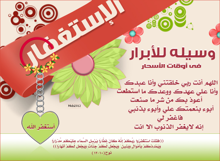 - · وعن البراء رضي الله عنه قال, قال النبي صلى الله عليه وسلم: من استغفر الله دبر كلّ صلاة ثلاث مرات فقال: أستغفر الله الذي لا اله الا هو الحيّ القيّوم وأتوب اليه... غفرت له ذنوبه وان كانت مثل زبد البحر.. وان كانت فرّ من الزحف.